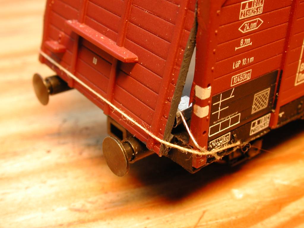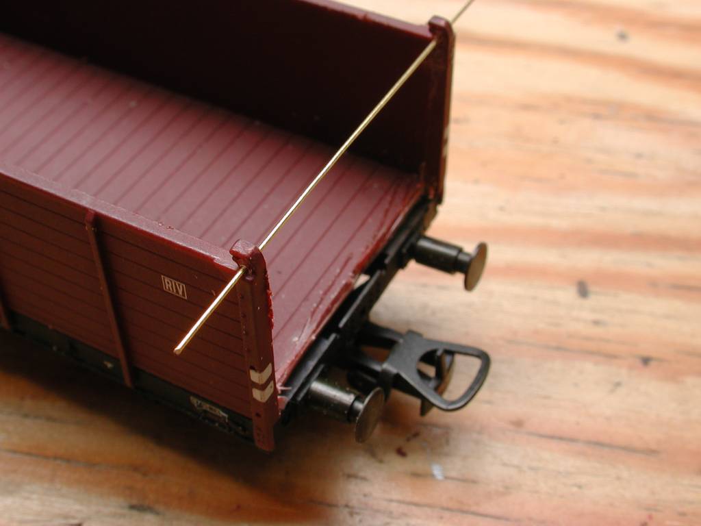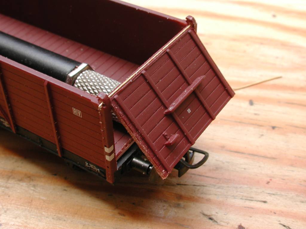 An den Draht wiederum habe ich die Kopfklappe dann mit Sekundenkleber angeklebt die kleine Stufe an der Oberkante der Kopfklappe ist wie dafür gemacht. Aber stop: vorher an der einen Kopfklappe Auftritt und Laufbrett entfernen nicht vergessen, da war Liliput zu großzügig. Der Wagen hat nun, wie in Bild 4 zu sehen ist, tatsächlich bewegliche Kopfklappen! Echte Superfrokler würden jetzt vermutlich darauf sinnen, auch die Kniehebelwelle (den Kopfklappen-Verschluß an der Unterkante) funktionsfähig zu machen; ich hab's gut sein lassen und den Kram nach dem Beladen festgeklebt. Bin ja kein H0pur®ist :-)