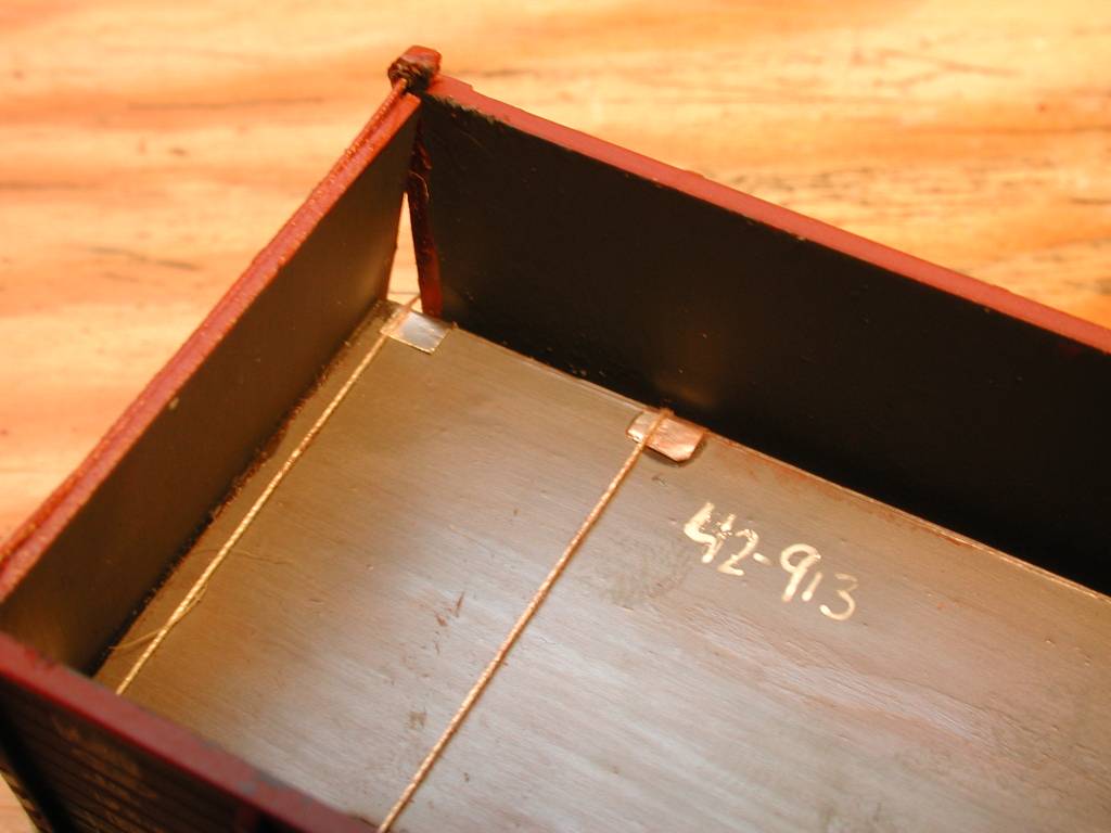 Die Ladungssicherung besteht aus drei Zusammenbindungen und zwei Niederbindungen an den Wagenenden, die durch den Kopfklappenspalt nach außen und dort an die vorbildwidrigen (s.o.), aber für diesen Zweck ungemein praktischen Panzerhaken führen. Bild 8 zeigt die Führung der Niederbindung bei umgeklappter Kopfklappe. Alle Bindungen bestehen aus verdrilltem Stahldraht, sprich: grauem Nähgarn, und sind mit Blechwinkeln aus Alufolie als Kantenschutz über die Kanten der Grobbleche geführt (auch dies habe ich bei Stefan Carstens abgekuckt).