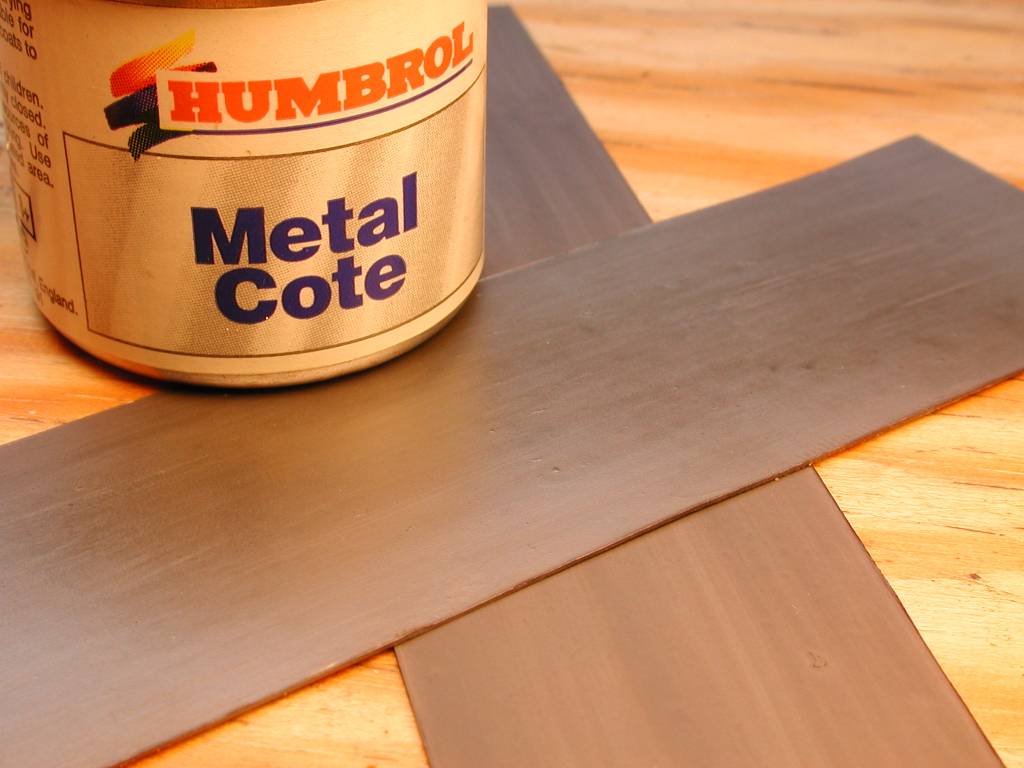 Die Lackierung der Bleche erfolgt mit "Humbrol Metal Cote Steel", einer polierbaren Lackfarbe, und zwar einfach mit dem Pinsel. Nach dem Trocken ist das Zeug stumpf-mattgrau, aber wenn man's mit einem weichen Tuch poliert, glänzt es sehr schön metallisch. Bild 6 zeigt zum Vergleich ein lackiertes und ein poliertes Stück Grobblech man beachte die zu erahnende Spiegelung der Farbdose. Die Pinselstriche gehen locker als leichte Verschmutzung, Wasserflecken, Fett o.ä. durch; m.E. wirkt das Teil mit der leicht unregelmäßigen Oberfläche sogar gerade gut. Aber Vorsicht: nach dem Trocknen nicht mehr mit den Fingern anfassen, das gibt gut sicht- und kaum wegpolierbare Abdrücke. Woher ich das nur wieder weiß?
