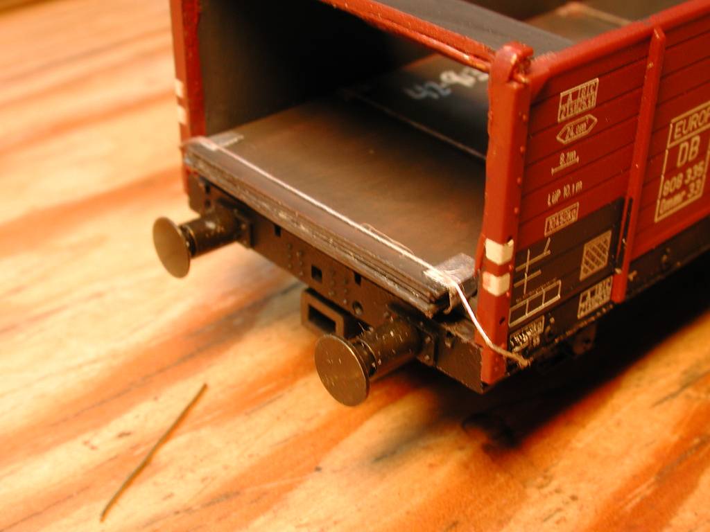 Um den trotz allem immer noch zu dicken Boden des Wagens etwas wegzutarnen, habe ich die unteren zwei Lagen Grobblech nur als kleine Schnipsel an den Wagenenden untergeklebt, so daß der zu dicke Wagenboden quasi in die Ladung hineinragt.