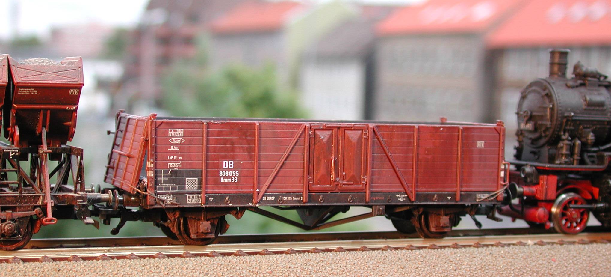 Damit das Ganze im Modell einigermaßen überzeugend aussieht, sollten die Wände und vor allem der Wagenboden des verwendeten Modells schön dünn sein. Meine Wahl fiel deshalb auf dem Omm 33 (Villach) von Liliput ein kürzeres Vorbild wie etwa GFNs O 10 (Halle) oder Om 12 (Breslau/Essen) erschien mir für Epoche 3 unpassend, da hätte man sicher eher einen Omm genommen, als so einen Aufstand zu machen.