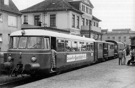 Bild 1: Der VT 6 der Elmshorn-Barmstedt-Oldesloer Eisenbahn stellte neben dem Uerdinger Schienenbussen der Gesellschaft einen Einzelgänger dar. Im Jahr 1960 steht der Triebwagen mit drei Personenwagen in Elmshorn.