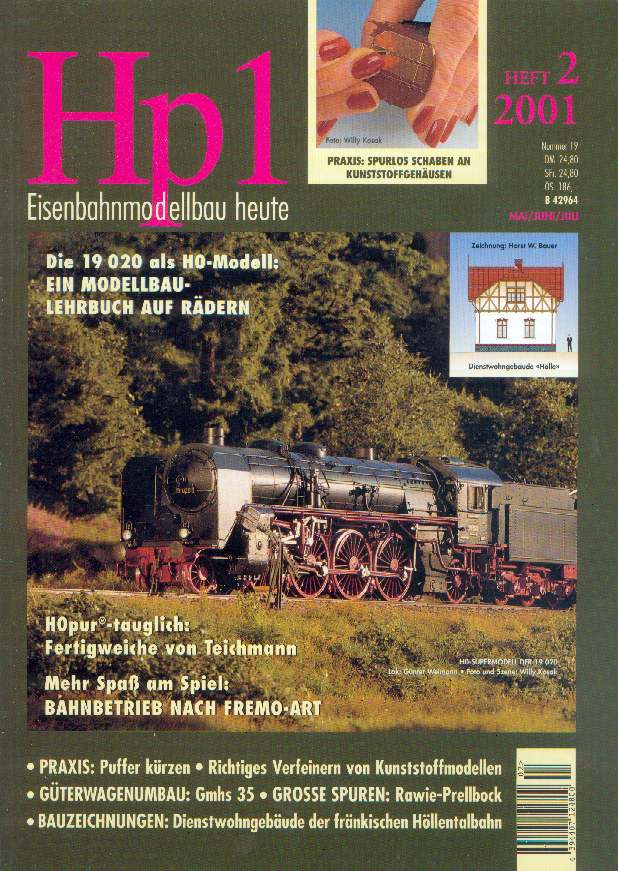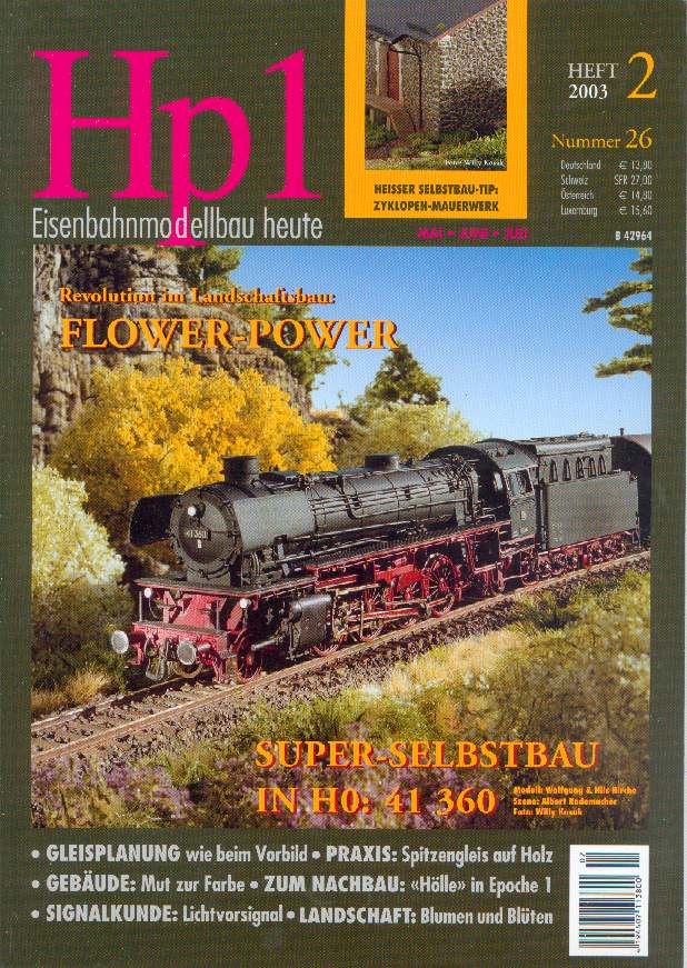 Die Titelstory ist der 18 316 gewidmet, jener Meßlok der Versuchsanstalt Minden. Folge 1 bringt Zeichnungen und Fotos sowie den Umbau des Tenders. Praxisnäher und typisch Hp1: Ausführliche Produktbesprechungen von Faltenbalgen und Übergangsgittern, die auch in Kurven für ein geschlossenes Zugbild sorgen. Warum berichtet da sonst keiner drüber? Schmalspur vom Feinsten: den Wismarer Triebwagen der Rhein-Sieg-Eisenbahn sind zahlreiche Vorbildfotos und Modellumbauten gewidmet. Der Nordenhalben-Artikel wird fortgesetzt, und auch der Ommi 51 erscheint ein weiteres Mal, diesmal als Selbstbau in Spur 2 und Kleinserie in Spur 1. Der Gleisbau dreht sich diesmal um das Löten auf Holz mittels Hohlnieten. Auch der Vorsignal-Artikel geht weiter. Ebenfalls typisch Hp1: daß man einer unscheinbaren Pflanze wie dem wilden Rhabarber oder auch einem schlchten Bretterzaun genausoviel Raum widmet wie mancher Lok. Verdientermaßen!