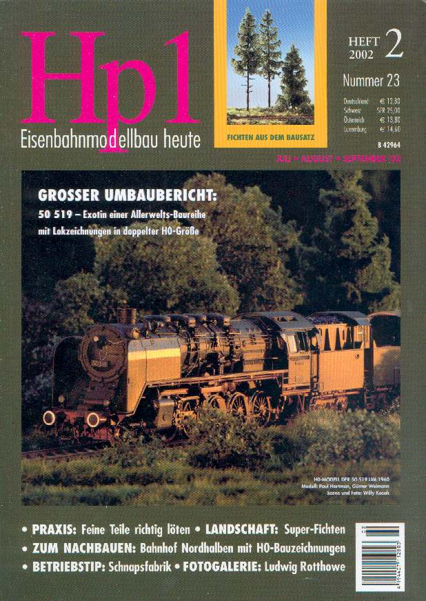 Paul Hartman stellt seine 50 mit Kabinentender und Wagnerblechen vor, selbstverständlich in H0pur. Wie immer: tolle Fotos, Zeichnungen von Alfred Fordon (von beiden Lokseiten, was es viel zu selten gibt!), insgesamt 26 Seiten – wow! Der Güterwagenfrokler kommt beim Artikel über den Ommi 51 und dessen Bremsanlage auf seine Kosten; auch die Rangiergeräte sind interessant. Und Fotos von Ludwig Rotthowe, hier aus Österreich, bedürfen eh keiner Lobpreisung mehr. Der Bahnhof Nordenhalben wird vorgestellt, mit Gleisplan und Zeichnungen vom EG. Der Vorsignal-Artikel wird fortgesetzt, und es gibt einen Artikel über die Spirituosen-Fabrik "Auf's Blatt" in Lippstadt mit vielen Fotos der interessanten Gebäude. Cramers Drehkran ist Anlaß für die Nachbildung einer Granitverladung im Frankenwald, gewürzt mit je einem ordentlichen Schuß Bier und Humor. Und die Fichten von miniNatur runden das Spektrum ab – alles da bis auf Gleisbau, seltsam :-)