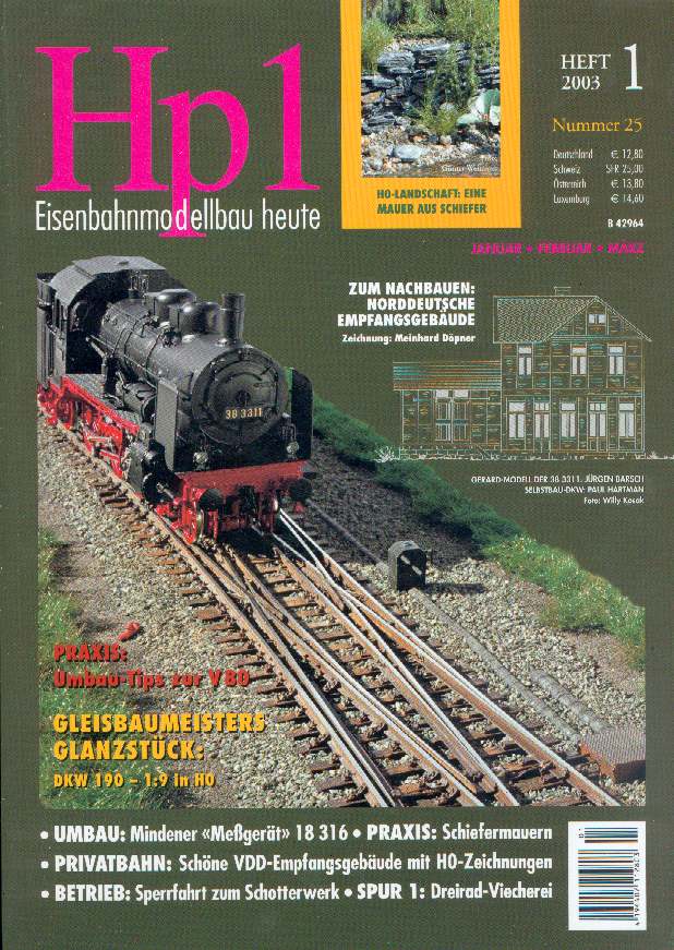 Nein, die P8 (übrigens von Gerard) auf dem Titel ist nicht die Titelstory, sondern die DKW 190-1:9 in H0pur, über die sie gerade fährt. Schöne Lokbilder gibt's aber trotzdem: 18 316 wird fertiggestellt. Ebenso eine Roco-V 80, deren Besonderheit, nicht-durchstoßende Federpuffer, auch diesseits von H0pur interessant sein dürfte. Den Gebäudefreaks gibt's Bilder und Zeichnungen des EG Thüste (Stahlfachwerk!) und des Lagerschuppens Salzhemmendorf. Mittlerweile Teil 4 der Vorsignal-Geschichte, aber langweilig wird's nicht. Etwas langatmig hingegen der Artikel über Viehtransportkisten im Spur-1-Modell, hier wäre weniger mehr gewesen. Wunderbar hingegen wieder diese Kleinzeug-am-Rande-Artikel über Weidezäune und Schiefermauern; auch die fahrbaren Rottenbuden sind lustig. Und Betrieb gibt's auch: Bedienung des Schotterwerks Heberndorf mit Schlüssel-Erlebnis in Form verschlossener Weichen.