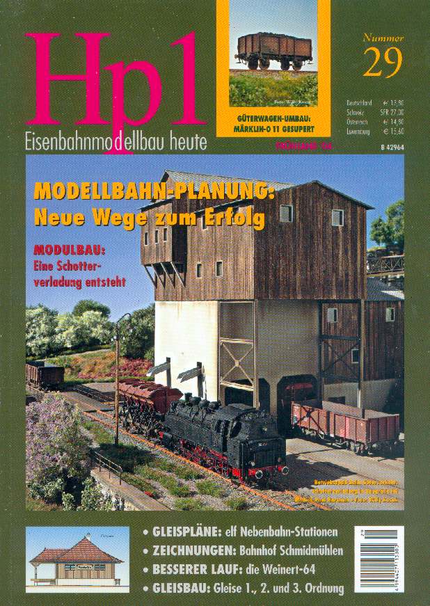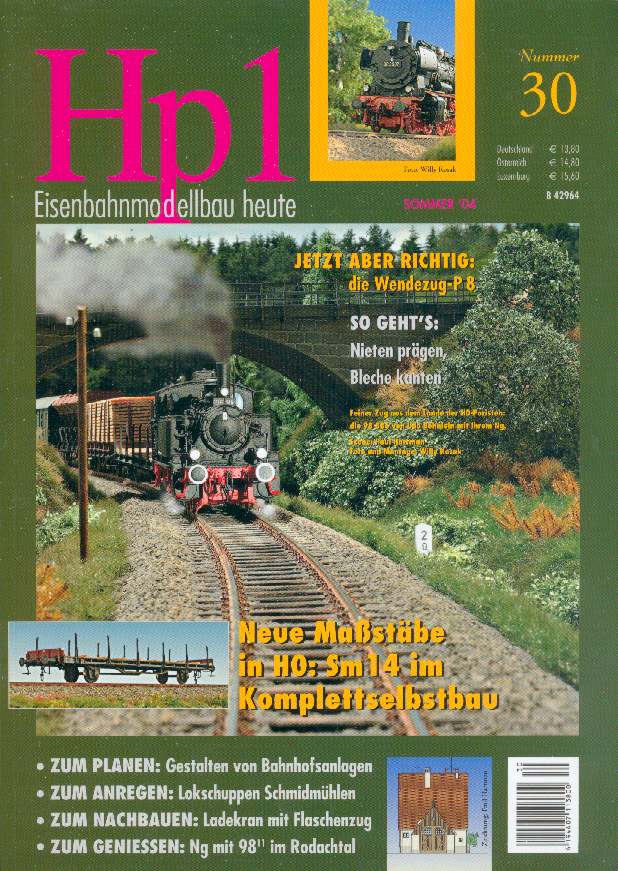 Die Wendezug-P8 war ja schon mal Thema (siehe Nummer 18). Diesmal nun in H0, und wohl dem, der sie nicht bei GFN erwarb. Muß ich die vielen Vorbildfotos erwähnen? Nö, muß ich nicht. BLumen und Goldrute von miniNatur bekommen drei Seiten, die sie auch verdienen: so paßt's! Grundlagen zur Bahnhofsplanung werden gefolgt von Konkretem: dem Lokschuppen von Schmidmühlen, Teil 2 der im letzten Heft begonnenen Serie. Für die Güterwagenfans gibt's einen in allen Teilen maßstäblichen Sm 14 als Ätzbausatz, mit dem üblichen Berg an Vorbildfotos und (Carstens-) Zeichnungen in drei Bauzuständen nebst Praxistips zum Abkanten und Nietenprägen. Der Sm 14 dient dann auch gleich als Staffage für einen eigentlich ganz simplen Ladekran. Und ein Zeitdokument gibt's auch noch: Stimmungsvollen Farbaufnahmen von 1964 (!) von 98 1118 vor einem Ng auf der Rodachtalbahn wird der gebührende Platz eingeräumt.