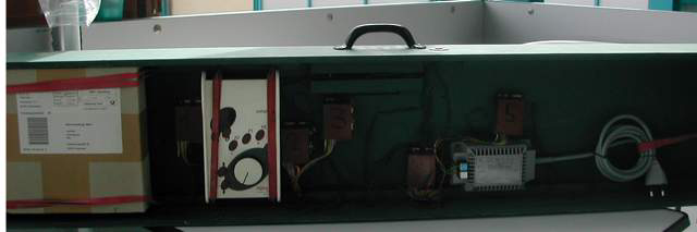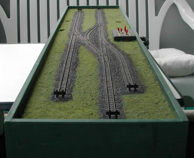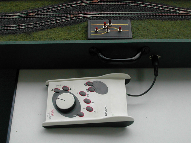 Der Unterbau besteht aus einem einfachen Holzkasten mit den Maßen 120cm x 25cm und 10cm Höhe. An diesen wurde noch ein preiswerter Griff aus dem Baumarkt geschraubt, um die Anlage später gut handhaben zu können. Der Kasten wurde komplett mit grünem Schultafellack gestrichen. In diesem sind das Stellpult, der Trafo, 5 Weichenantriebe und eine 5 polige Diodenbuchse für den Fahrregler eingebaut. Gefahren wird entweder analog oder digital. Für beide Betriebsarten halte ich entsprechende Fahrregler vor. Im Analogbetrieb fahre ich mit einem einfachen Selbstbau – Handregler, der eine geglättete Gleichspannung ans Gleis bringt. So können auch Loks mit Glockenanker – Motor (Faulhi) schadlos betrieben werden. Im Digitalbetrieb fahre ich mit einem einfachen Lenz "Compact". Da die Steckerbelegung beider Regler identisch ausgeführt ist, kann durch einfaches Umstöpseln die Betriebsart gewechselt werden. Der Trafo ist ein Lenz "TR100" mit 15V / 45 VA. Die fünf Weichenmotore stammen von Tillig und waren noch von einem Anlagenabriss übrig. Es sind zwar nicht die leisesten und besten Antriebe, als Mittel zum Zweck reichen sie aber dennoch völlig aus. Hätte ich diese nicht zur Verfügung gehabt, hätte ich mir handbetätigte Stellgestänge gebaut, die mittels Miniaturschaltern die Herzstückpolarisation bewerkstelligen. Das einfache Gleisbildstellpult besteht aus fünf kleinen Schaltern und einem kleinen Gehäuse aus dem Elektronikfachhandel. Nach dem Auflackieren des Gleisbildes wurden die Löcher für die Schalter gebohrt und diese ins Gehäuse eingeschraubt. In die Unterseite des Gehäuses kam noch ein größeres Loch für die Kabeldurchführung. Das fertige Gleisbildstellpult wurde versenkt in die Grundplatte der Anlage eingebaut.