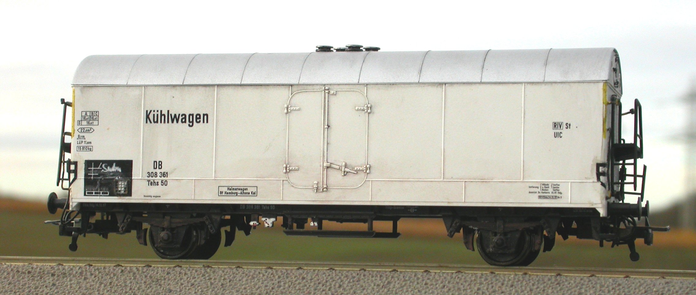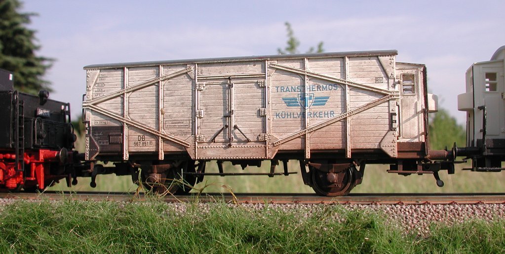 Realisierung: Wagenkasten mit Lasurmethode gealtert und großzügig mit neu auflackierten Flickstellen versehen; Türen neu lackiert, um eine Ausrede zu haben, warum die gänzlich beulenfrei sind (sind halt gerade neu gekommen); Alterung des Fahrgestells fehlt noch. Bitte das suboptimale Bild zu entschuldigen, der Wagen ist nicht mehr bei mir (war ja auch nie meiner, was soll ich mit Epoche 4?)