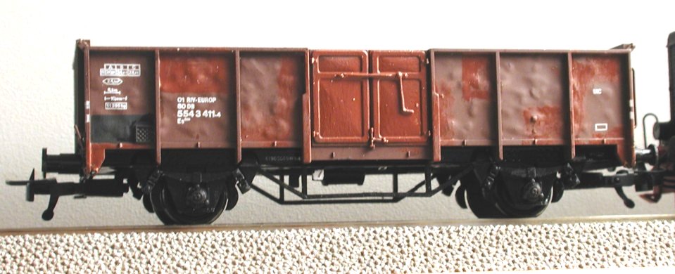 O-Wagen sind meist einfach nur vom Ladegut eingestaubt. Meistens war das in früheren Epochen Kohle, also braucht man dafür im Prinzip nur den Ruß- und Dreckschleier von weiter oben etwas dicker aufzutragen. Besonders natürlich auf der Innenseite, die zumindest bei frisch entladenen Wagen tatsächlich opak schwarz gewesen sein dürfte.