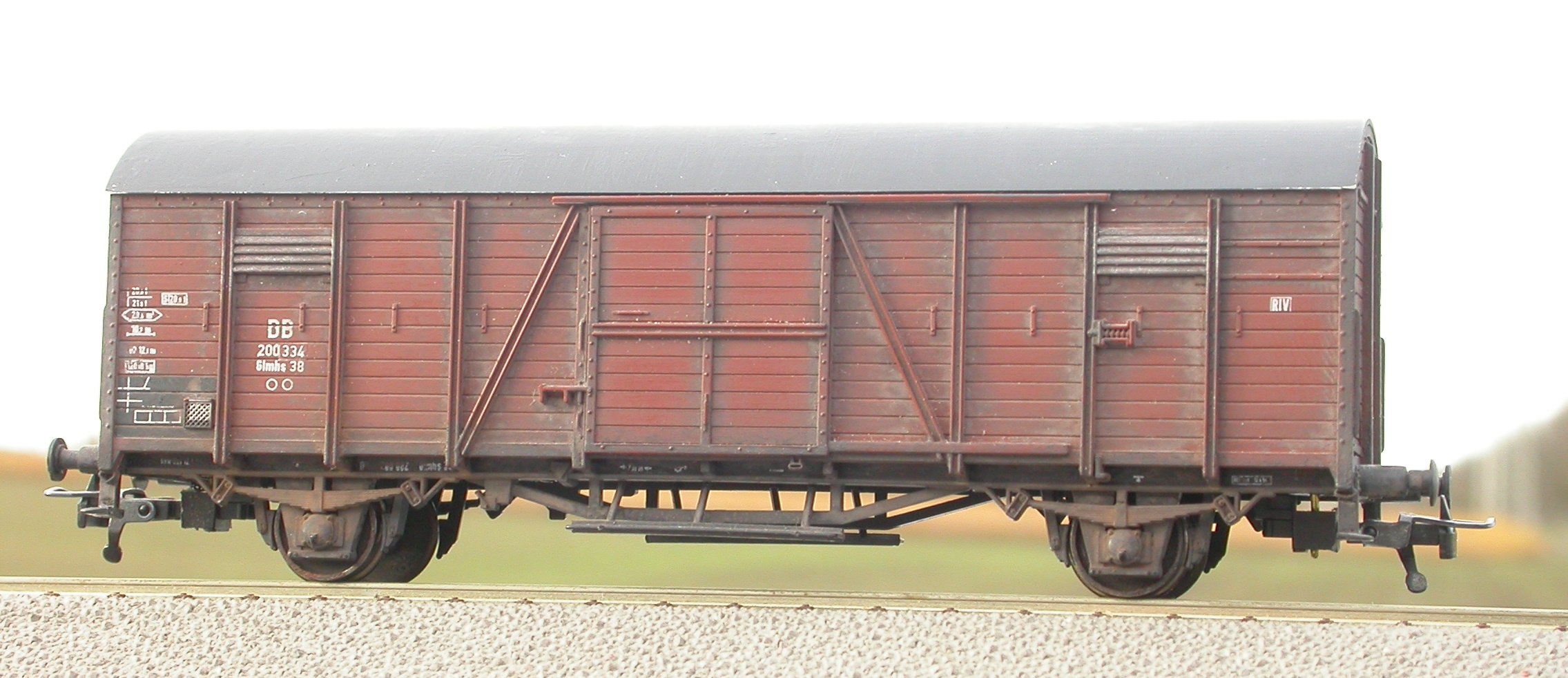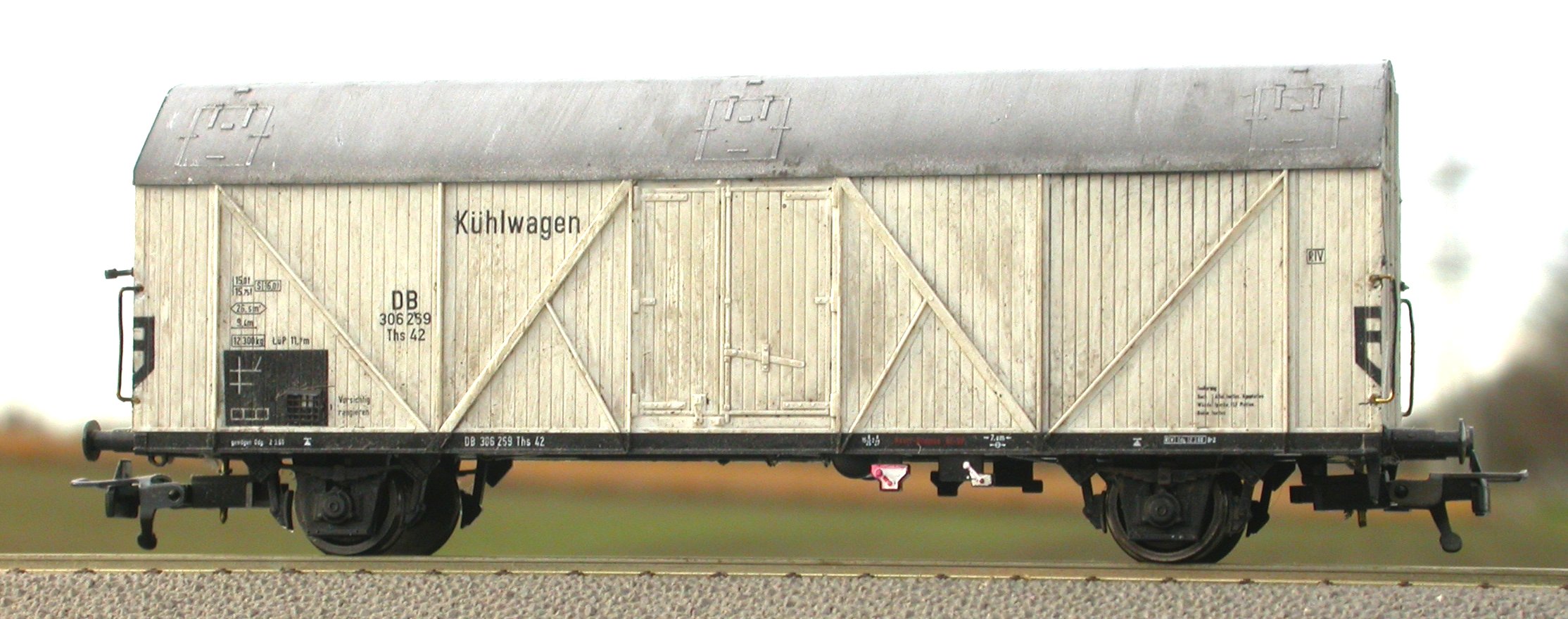 Realisierung: Wagenkasten und Dach mit verdünnten Mattfarben gealtert; Fahrwerk incl. Radsätzen matt mit leicht abgetönter Farbe neu lackiert