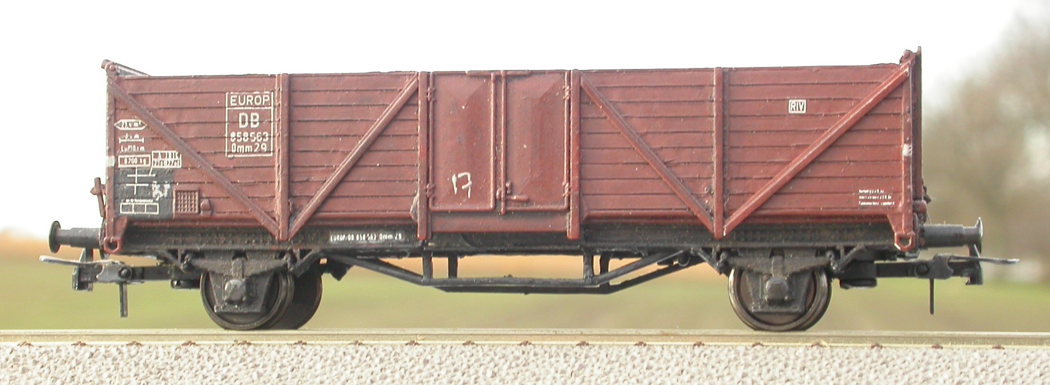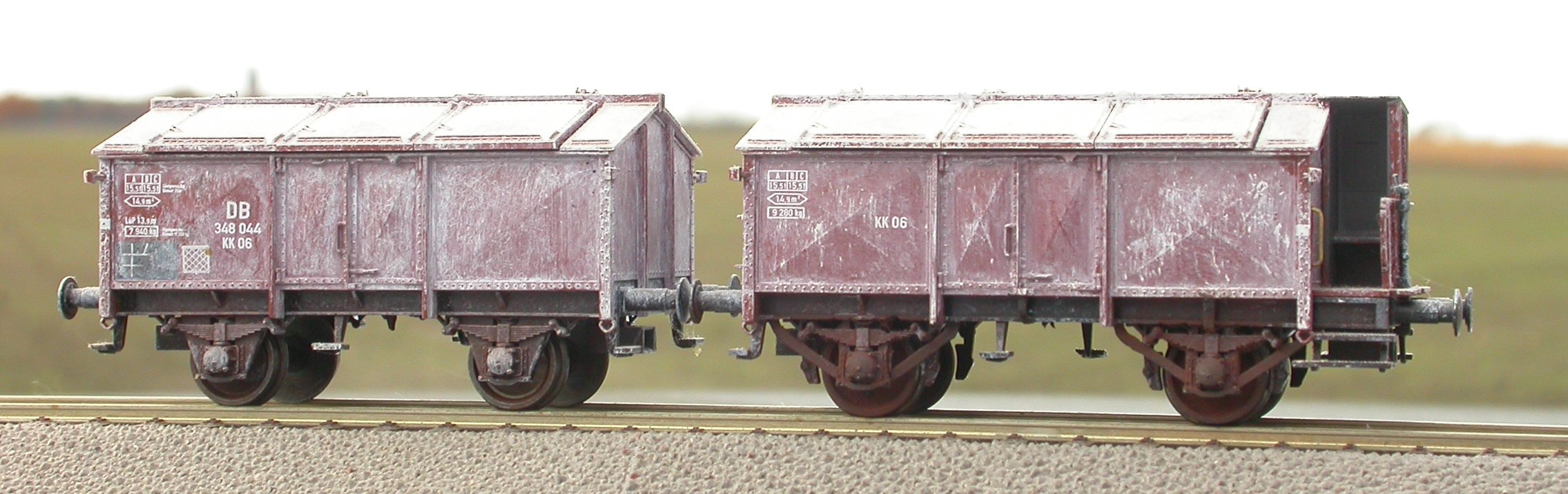 Bekannter unter dem falschen Namen "Klappdeckelwagen", sind diese Fahrzeuge auch dankbare Opfer für mit der großen Kelle aufgetragenen Dreck. Gern natürlich weißlich, um Kalkspuren zu imitieren — aber auch hellgrau für Zement ist möglich, und je nach Ladegut sicher auch andere Farben. (In Klappdeckel-Selbstentladewagen wie KKt 26 und KKt 45 hat man zum Beispiel auch Koks gefahren, warum sollte man das nicht auch mit normalen K-Wagen können?)