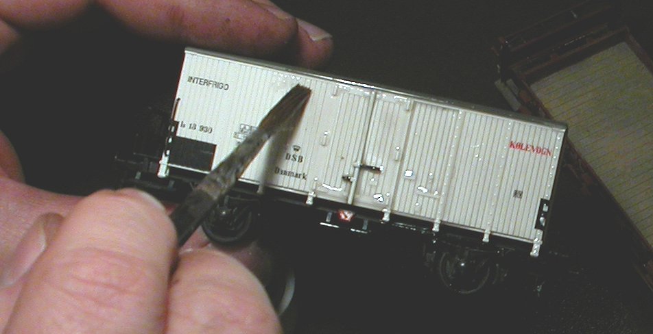Wohl die bekannteste und üblichste Methode, hier aber nicht umsonst als letzte aufgelistet: das Einpinseln des Modells mit verdünnter Farbe und anschließende Abwischen derselben, so daß sie in den Vertiefungen bleibt und so die Konturen betont. Das Problem dabei ist: diese Konturen sind bei Modellbahnwagen meist ohnehin schon überzeichnet (vor allem Bretterfugen — man redet da nicht umsonst auch von "Bretter-Grand-Canyons") und bedürfen keiner Betonung, eher im Gegenteil.
