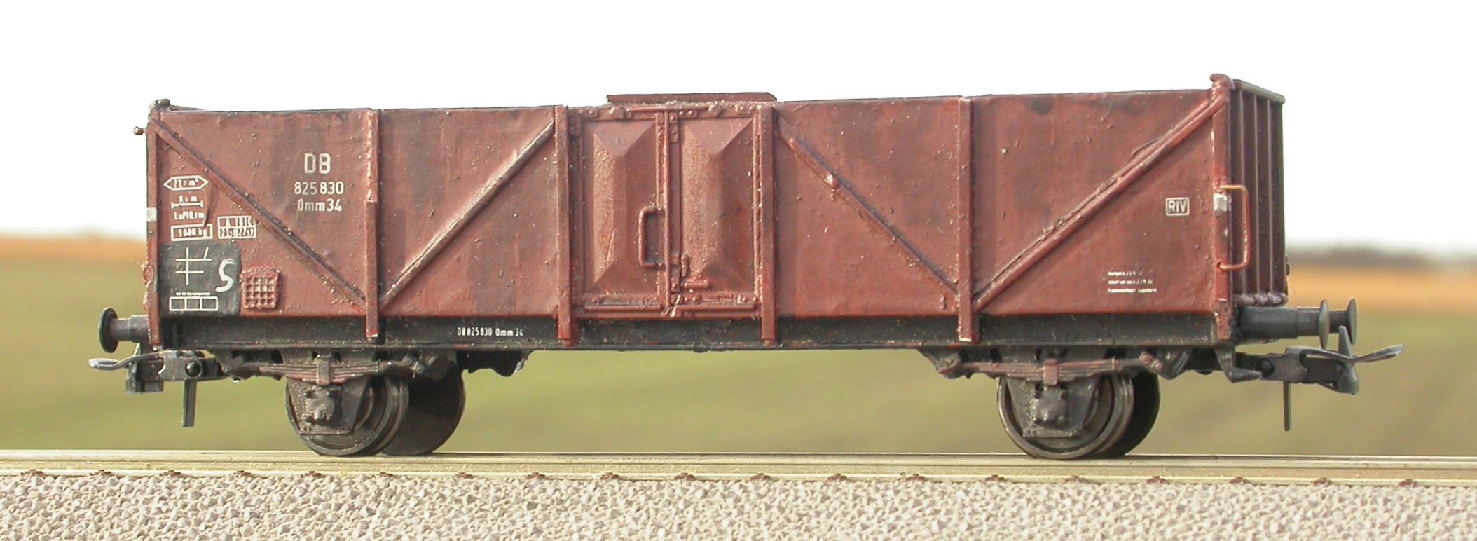 Grundsätzlich sollte man es mit Rost am Aufbau nicht übertreiben. Der entsteht eigentlich nur da, wo Metall auf Metall reibt und deswegen der Lack schnell ab ist; offene Rostgeschwüre wie an alten Astras sieht man an Güterwagen eigentlich eher selten, wenn wir mal uralte Bahnhofswagen oder Rübenwagen kurz vor der Verschrottung ausnehmen. Dazu ist meist einfach das Material zu dick. Und wenn es dann wirklich irgendwann mal durch ist, wird es recht fix repariert (siehe nächsten Abschnitt), schließlich will man ja nicht, daß das Ladegut verschmutzt bzw. verlorengeht.