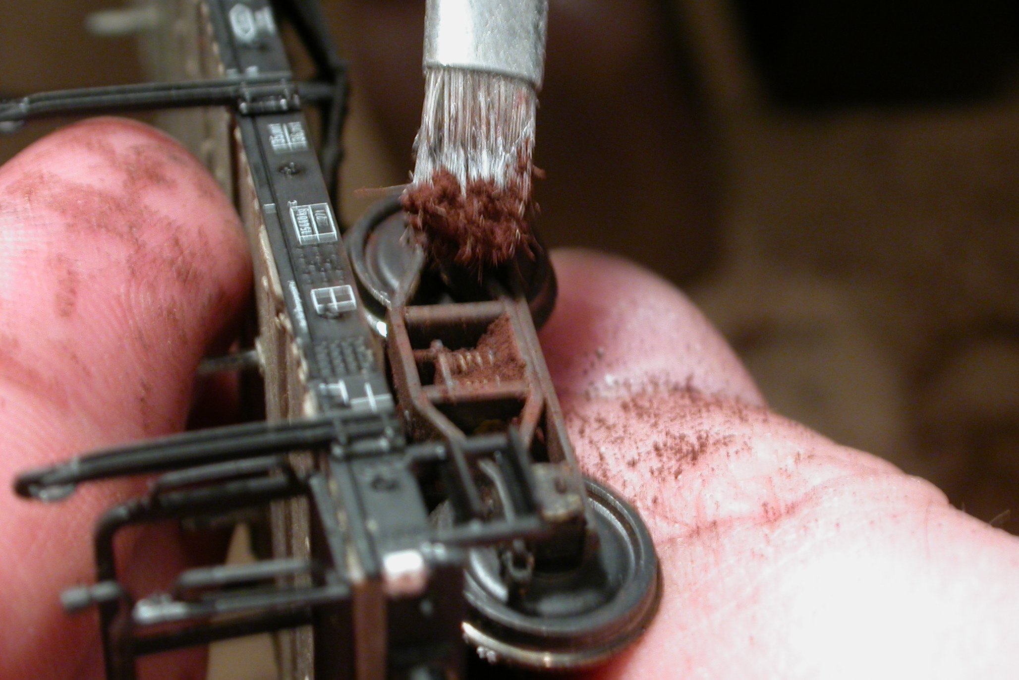 Um Bremsstaub nachzubilden, gibt es mehrere Methoden, die man durchaus alle mal ausprobieren und auch ruhig gemischt (bzw. nacheinander) verwenden sollte. Im Fahrwerksbereich ist die Sache am schnellsten mit Pulverfarben erledigt, und dort ist auch deren mangelnde Griffestigkeit nicht so das Problem — in die meisten Ecken so eines Fahrwerks kommt man mit den dicken Griffeln ja gar nicht hin. Am Wagenkasten ist eher Lasieren angesagt, um eine gleichmäßige Staubschicht hinzukriegen, naheliegenderweise stärker im unteren Bereich — hier greift sich Pulverfarbe dann doch schnell ab.