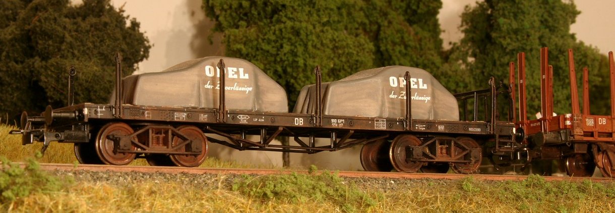 Realisierung: Wagenkasten leicht lasiert; Fahrwerk mit dreckig-rostig abgetönter anthrazitfarbener Abtönfarbe übergepinselt; Längsträgerbeschriftung zeigt noch einen gewissen Handlungsbedarf. Der Wagen selber entstand aus einem neu verstrebten Märklin-Omm 37-Wagenkasten und einem verlängerten Roco-Einfachserien-Fahrwerk.