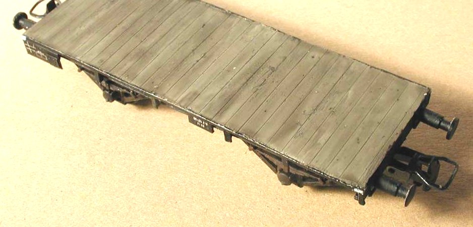 Realisierung: Wagenboden aus Bleiblech, Bretterfugen mit Messer eingeritzt, grau lackiert und großzügig dunkel lasiert.