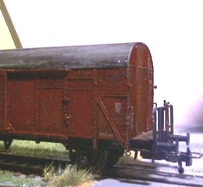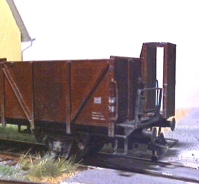 Abbildung: Omm 35 (Umbau aus Liliput-Omm 33 mit verkürztem Fahrwerk vom Röwa-Gms 54 und verlängertem Bremserhaus vom Roco-Omm 37). Das Bremserhaus ist hier bereits ohne Türen dargestellt, wie es in der Nachkriegszeit gerade bei dieser Bauart die Regel war.