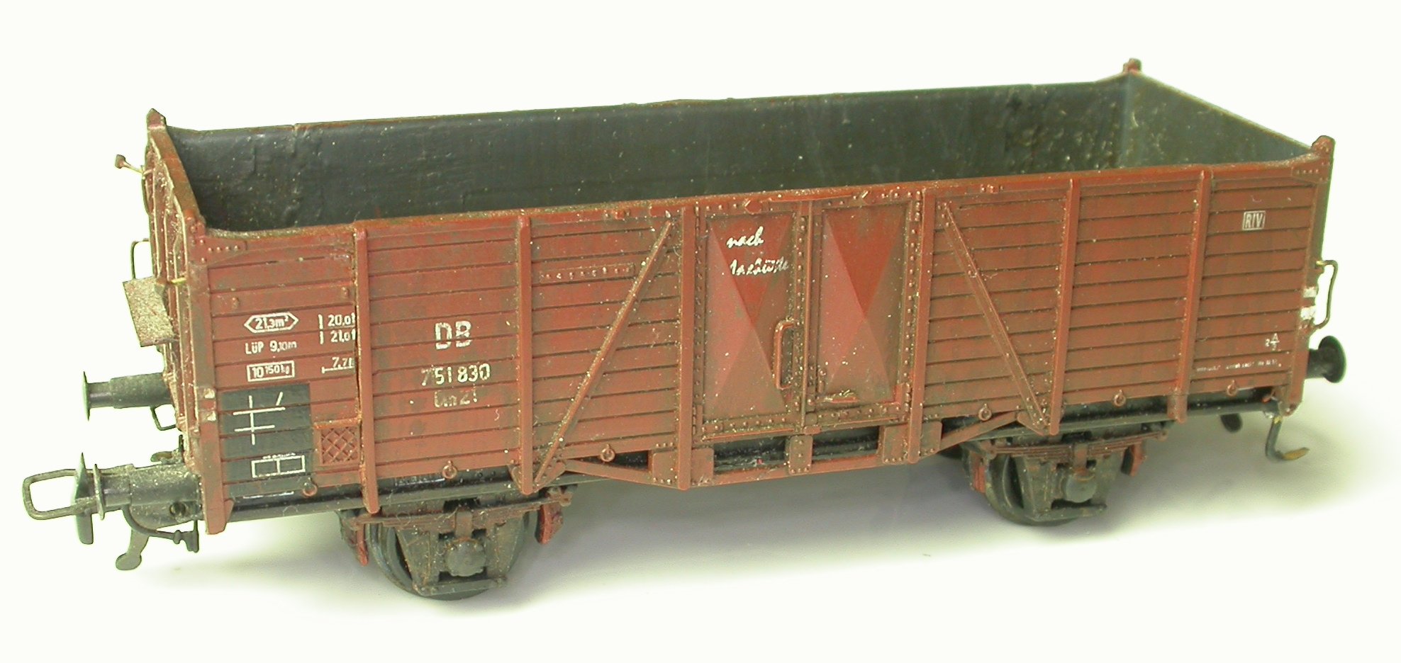 Was aber wirklich sensationell ist, ist die Gravur der Wageninnenseite. Bretterfugen dort hat man ja schon bei einigen Modellen gesehen, auch die Imitation der Fußbodenbohlen-Befestigungsschrauben ist glaubich keine Weltneuheit. Gebuckelte Türen sind indes schon seltener, und die Nieten an der Türinnenseite sind dann endgültig Anlaß für ein beeindrucktes "Booooaaah" oder drei. Wahnsinn! Brawa, Ihr seid Schuld, daß mir meine ganzen anderen O-Wagen von innen nicht mehr gefallen. ;-)