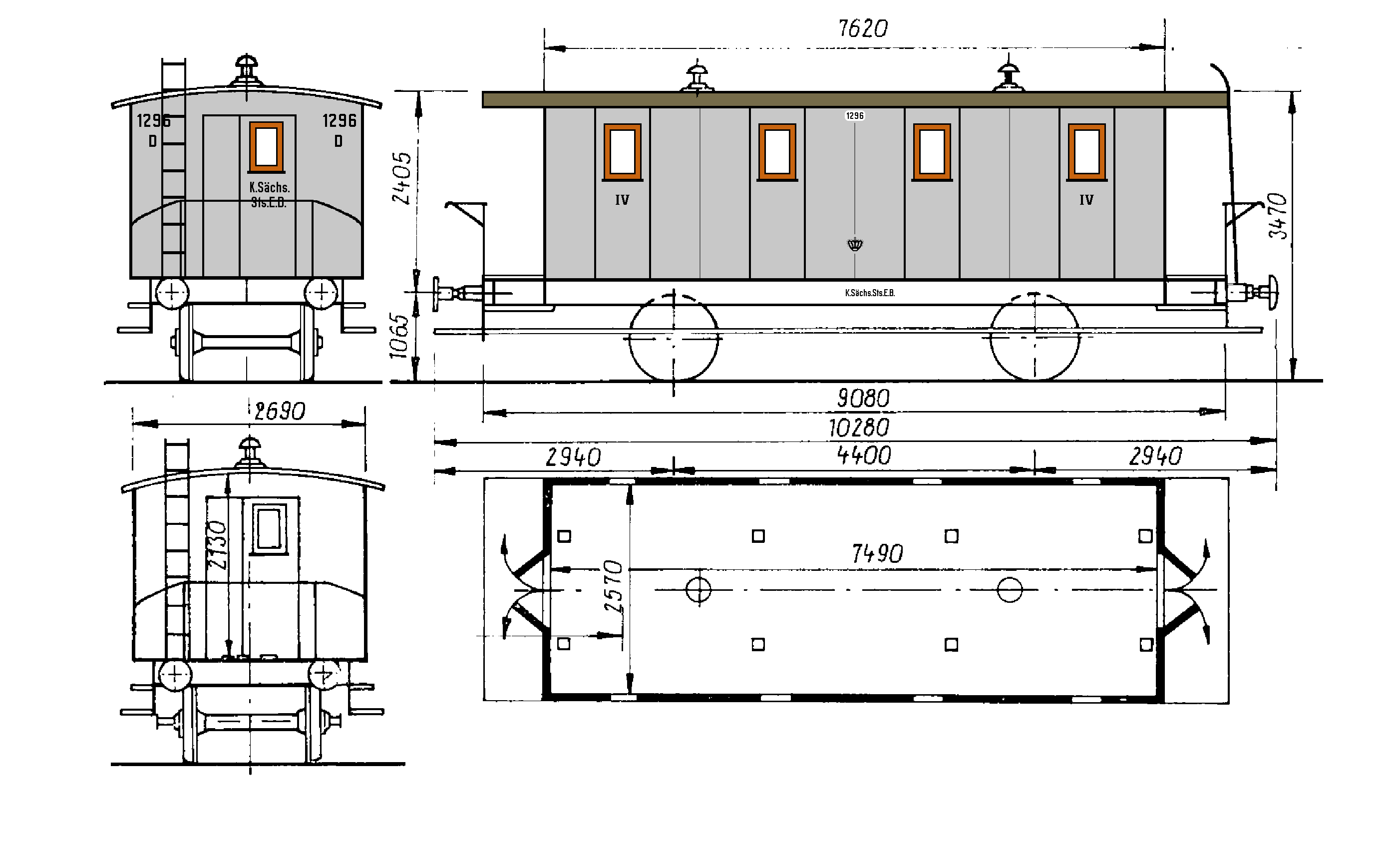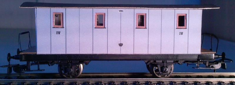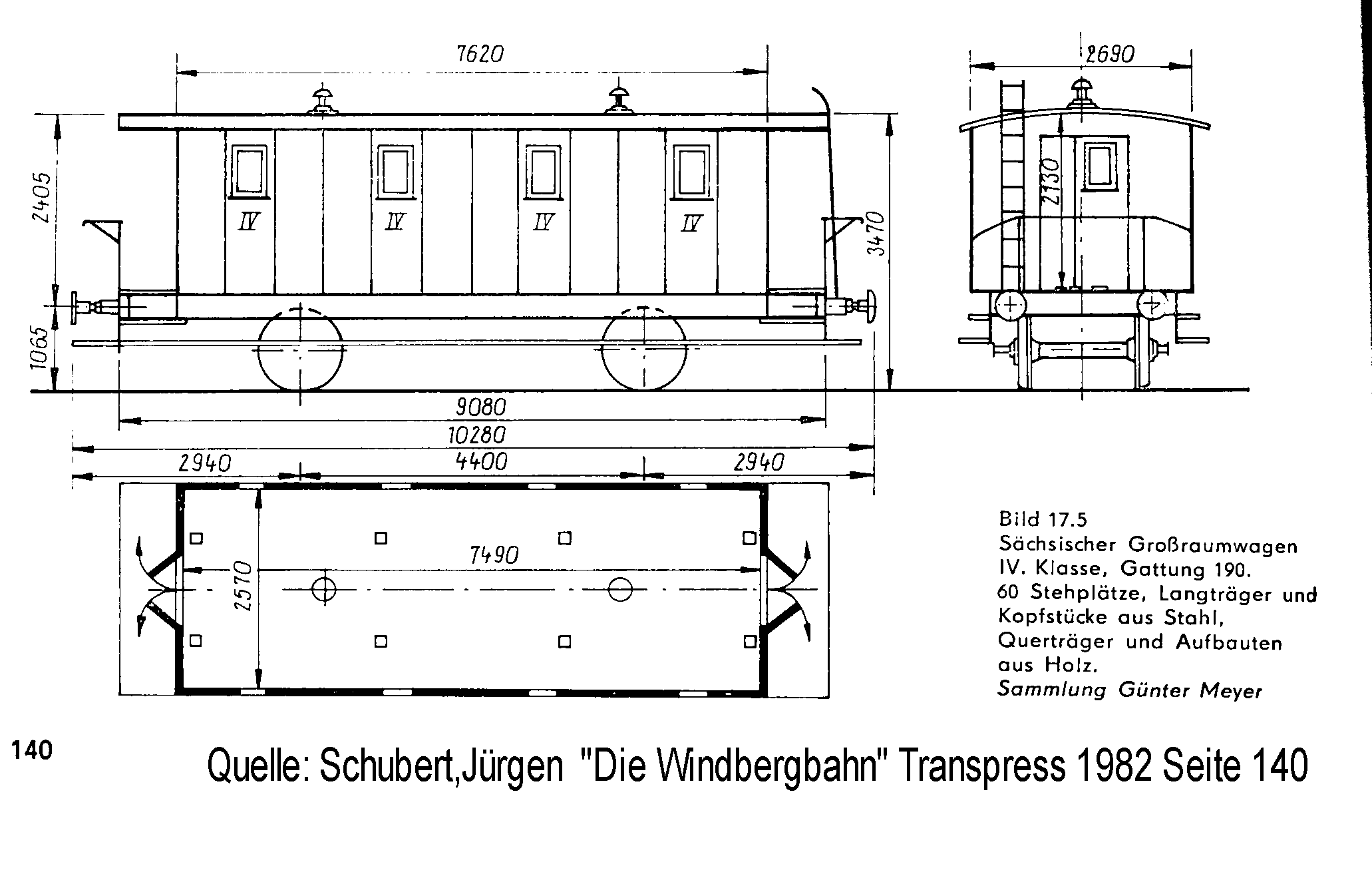 Der Wagen entstammt einer Serie von 6 Exemplaren, die 1875 bei Thielemann, Eggena und Co. in Kassel für die Chemnitz-Komotauer Eisenbahn gebaut wurden. Der Aufbau war aus Holz und eine Wagenbeleuchtung nicht vorhanden. Ab 1907 kam er auf der Windbergbahn zum Einsatz, umgebaut auf 4400mm Achsstand. Das einzige Vorbildfoto zeigt ihn im Eröffnungszug, aber Details sind leider nicht zu erkennen.