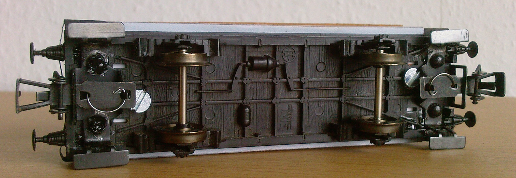 Der Unterbau ist nicht im Bastelbogen enthalten. Er entsteht aus einem Piko (alt) Untergestell mit 4500mm Vorbildachsstand. Spezialisten mögen auch einen exakt massstäblichen Rahmen zusammenlöten. Mir waren die Laufeigenschaften wichtiger als der 10 cm zu lange Achsstand.