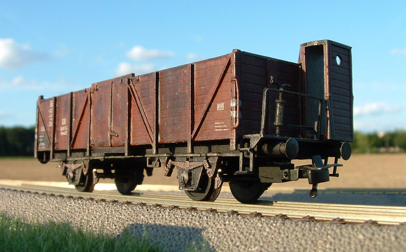 Griffstangen an drei Wagenkastenecken und am Bremserhaus, ein Rangierertritt und drei Weinert-Signalhalter komplettieren den Wagen. Die Gaßner-Beschriftung des Omm 34 habe ich bis auf die eine Ziffer unverändert übernommen. Wer liest schon Achsstände? (Davon mal abgesehen, daß der Wagen eh keine Rahmenbeschriftung hat.)