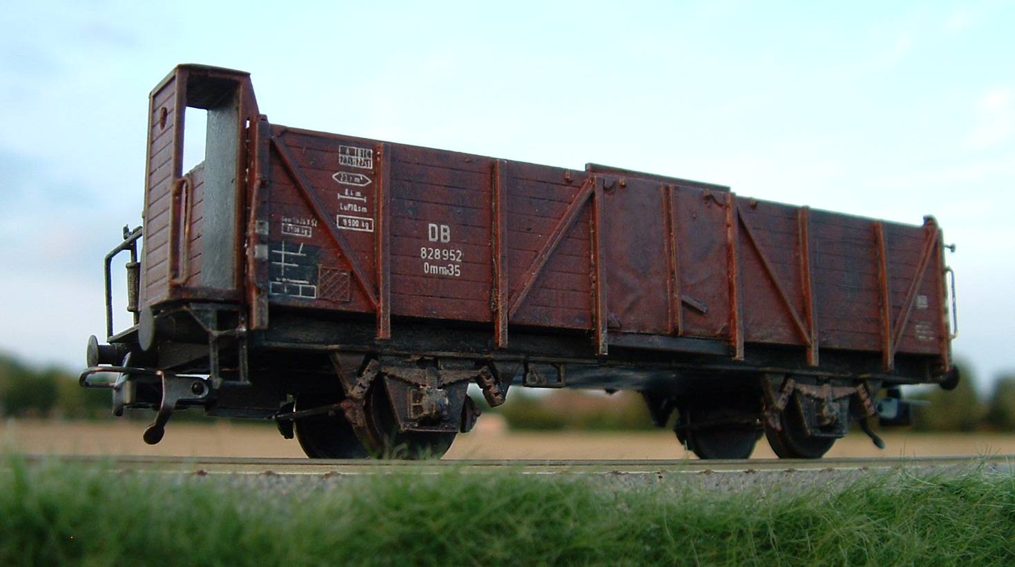 Das Stirnfenster habe ich durch ein simples Loch angedeutet; wer noch ein Übriges tun will, kann noch Türen (mit vertikalen Bretterfugen, aber ohne Fenster!) dazu bauen, mein Wagen hat indes keine mehr, was zumindest bei Omm 34 und 37 fast normal war und also vermutlich auch bei Omm 35 vorgekommen sein dürfte.