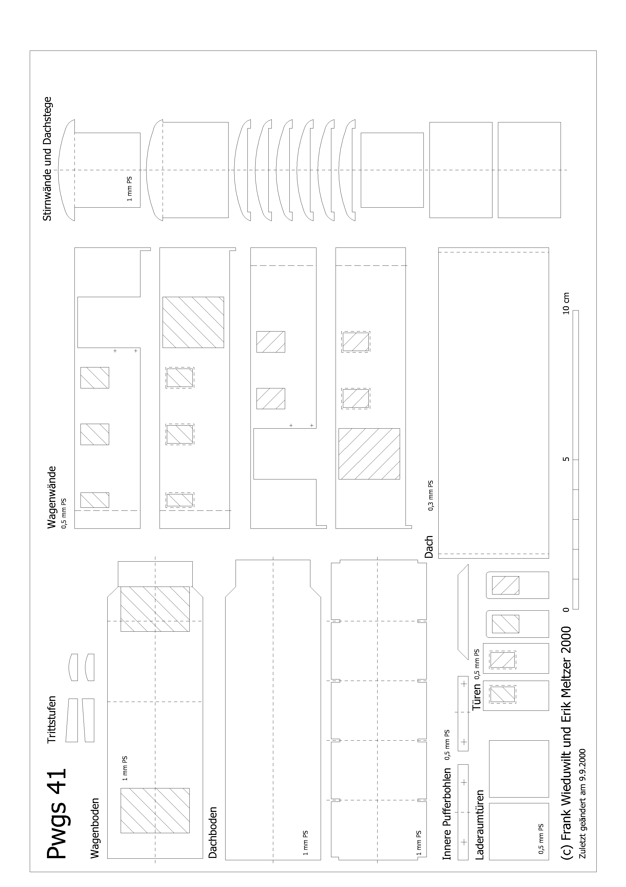 Die Idee, den Pwgs 41 aus Plastik zu bauen, stammt von Stefan Carstens. Stefan Carstens hat den Umbau auf Basis eines Piko-Pw in Miba 6 und 7/83 beschrieben. Doch wozu einen Piko-Pw zerschwarten, wenn es auch einfacher geht? Wir bauen Wagenkasten und Fahrgestell wie gewohnt aus PS, einige Teile kommen von Weinert und Liliput.