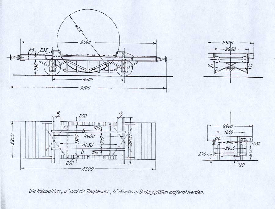 Der Nachbau dürfte nicht allzu schwierig werden. Entweder frokelt man ein halbwegs passendes Industriefahrwerk auf den richtigen Achsstand und baut den Wagenboden und den Haltekorb neu, hier bieten sich mal wieder die Fahrwerke aus der Roco-Billigserie an, oder wir bauen das Fahrwerk aus PS- oder MS-Profilen zusammen und versehen es mit den erwähnten Anbauten. Noch 'ne Anmerkung von Erik: 4,5 m Achsstand und 9,8 m LüP klingt nach simplem Verlängern eines G 10-Fahrwerks: ohne Handbremse 9,3, mit schon 9,6 m, da muß man nicht mehr viel dranfrokeln ;-) Der Ballast aus Bleiblech käme dann unter die Plattformen an den Wagenenden. mal abwarten, was uns dazu so einfällt.