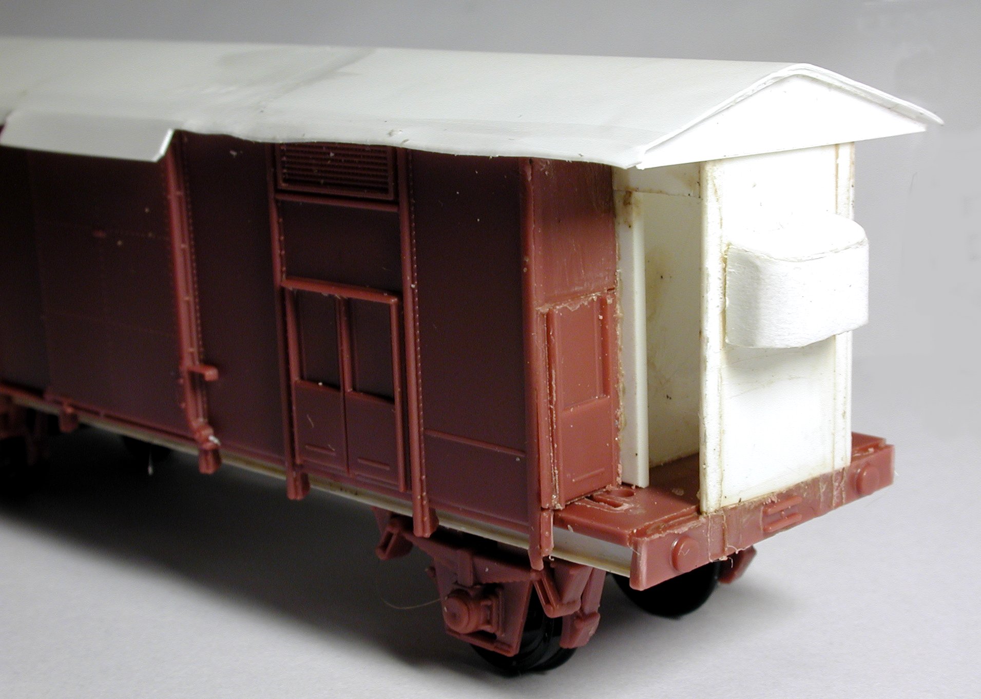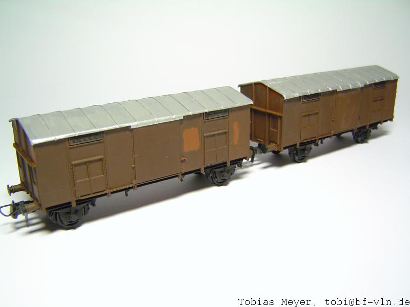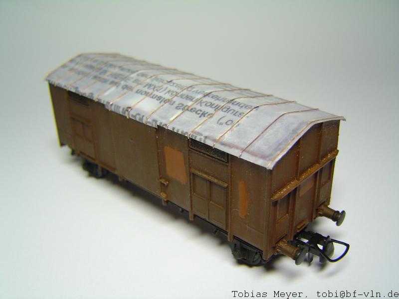 Sicher bin ich nicht, aber für mich sieht das aus wie ein umgebauter Satteldach-Hg. Außer dem Tonnendach und den neuen Achshaltern bedarf noch die Tür ein wenig der Zuwendung, aber m.E. ist das trotzdem lohnender, den TTM-Bausatz umzufrokeln, als für teures Geld und mit viel Mühe einen Laser-Wagen zu ergattern. Mehr dazu, wenn's soweit ist.