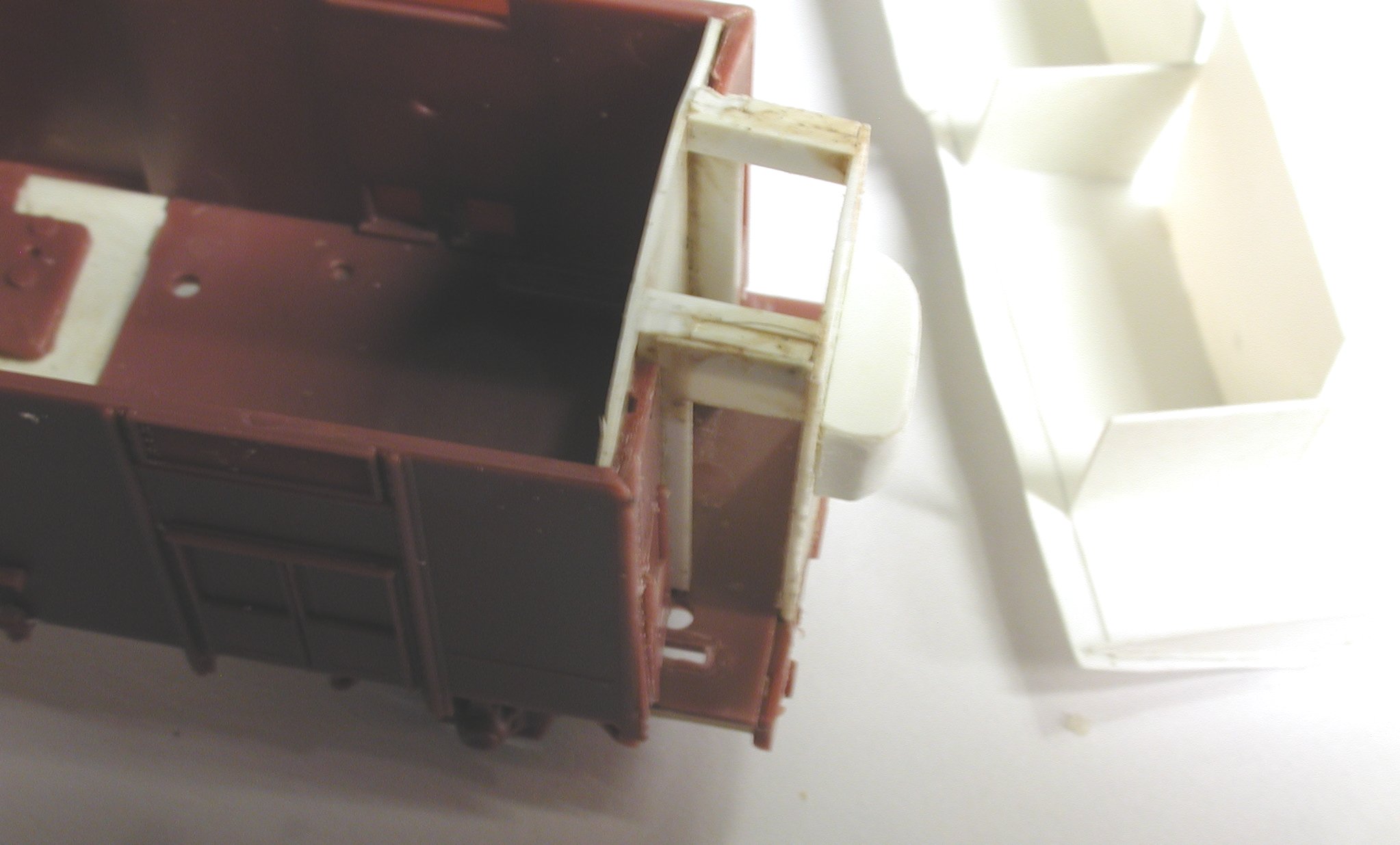 Ich habe meinen F Dächer aus Papier verpaßt, einerseits weil jemand anderes die original Plastikteile besser gebrauchen konnte als ich, andererseits weil Papier dünner ist. Damit ein solches Dach trotzdem stabil ist, muß als erstes der Wagenkasten selbst stabilisiert werden. Dazu habe ich in der Mitte einen etwa 10 mm breiten Polystyrolstreifen eingeklebt, der die Wände des Wagens auf dem richtigen Abstand hält. Außerdem habe ich zwei Dachspanten eingeklebt. Diese sind auf Bild 3 noch recht gut als helle Streifen beidseits der Schiebetür durch das unlackierte Dach zu sehen.