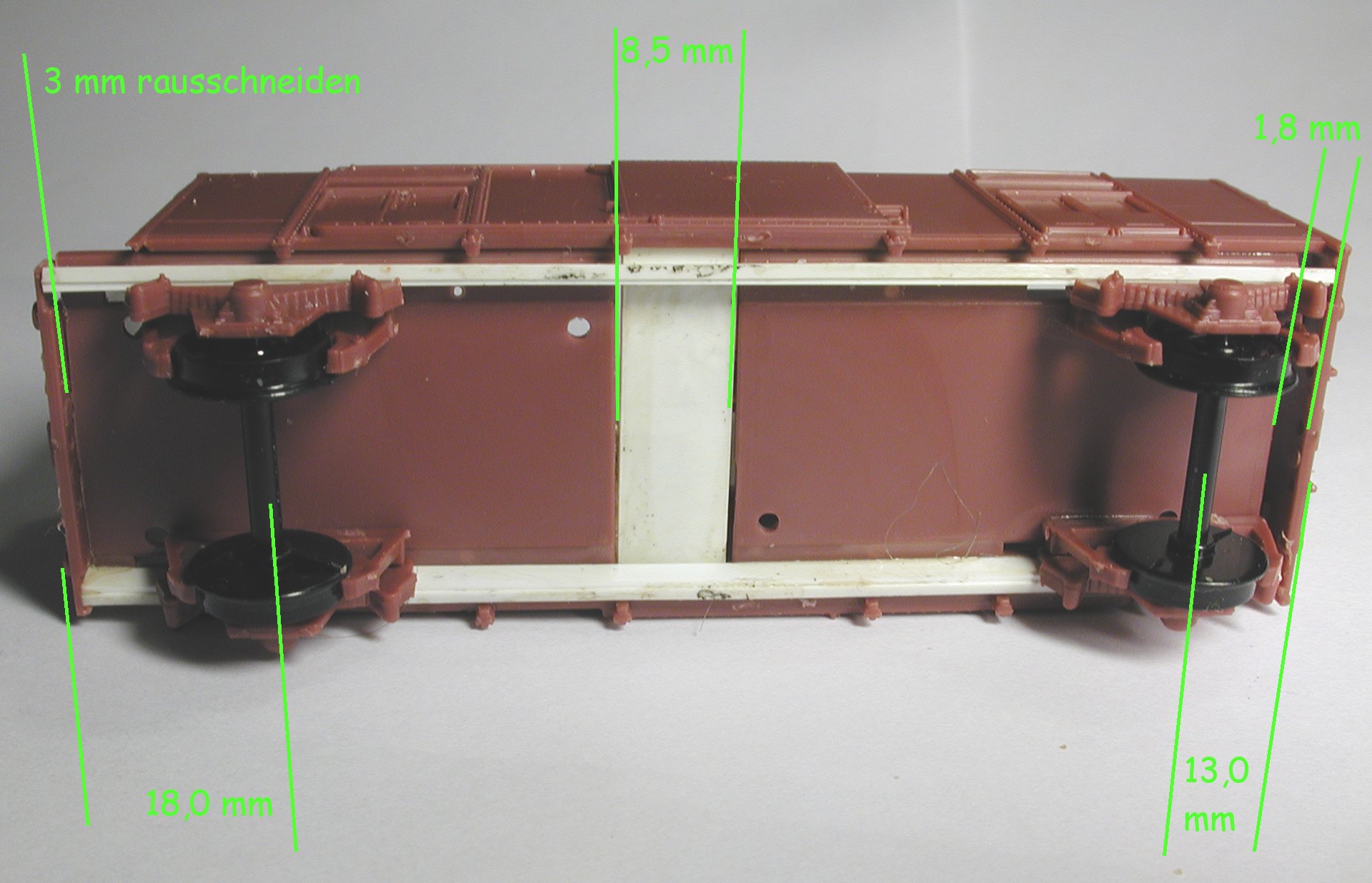 Die Soll-Maße für den Überhang (Rahmenende bis Achsmitte) betragen laut [6] 1485 mm auf der Bremserbühnenseite und 1105 mm am anderen Ende. Beim Wagen ohne Bremserhaus beträgt dieses Maß 950 mm. Demnach muß die nichtbühnenseitige Achse im Modell also rund 1,8 mm weiter nach innen. Bild 8 zeigt den Aufbau und die Maßangaben.