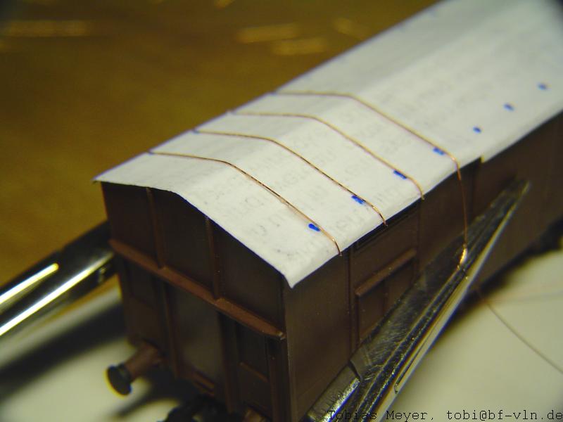 Einige "Mittäter" unserer ersten Sammelbestellung müssen leider wegen einer Verdaddelung meinerseits die Wagendächer selberbauen; spätestens beim Umbau in längere Vorbilder (s.u.) ist das aber auch dann empfehlenswert, wenn man Dächer hat, da die zu stückeln auch nicht weniger Aufwand ist, wenn's gut aussehen soll.