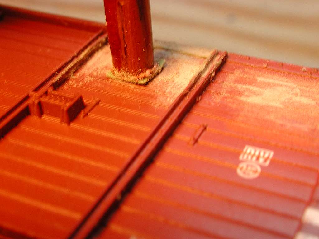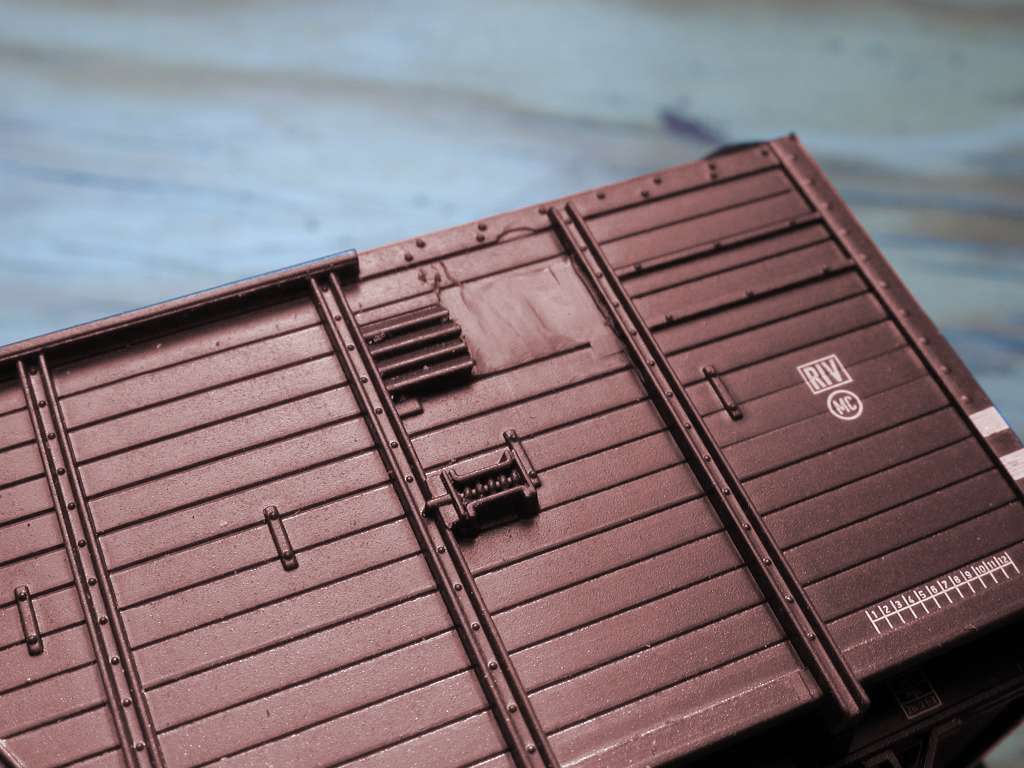 Hier besteht die Hauptarbeit im Entfernen der Lade- und Lüftungsöffnungen und dem Einbau der Fenster. Verglichen damit wird das Nachrüsten der Knotenbleche, wie sie genietete Gllh 24 im Gegensatz zu geschweißten Glmhs 38 ja hatten, und der Umbau der einen Stirnseite auf Handbremse geradezu ein Spaziergang.