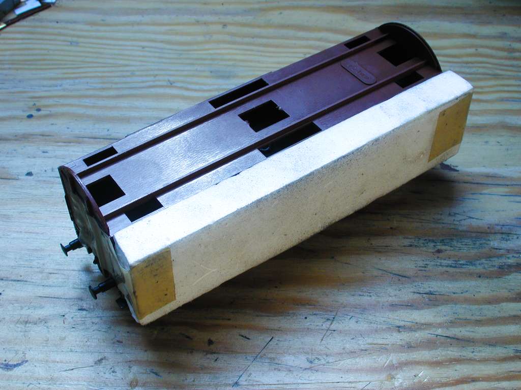 Doch halt: vorher muß man natürlich dafür sorgen, daß der Wagenkasten stabil und genau horizontal liegt. Manche tun das von selber, andere, und so auch der Roco-Dresden, kippeln. Am einfachsten baut man sich die nötige Unterfütterung aus einem Stück Hartschaum: Wagen kräftig andrücken, die am deutlichsten eingedrückten Stellen ausschneiden, wiederholen bis nix mehr kippelt. Im Bild 7 habe ich die fraglichen Stellen markiert: auf der Stütze in echt, am Wagen mit dem Malprogramm.