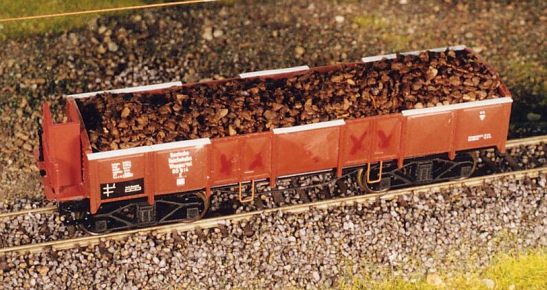 Es wird der bekannte Einsatz aus Schaumpolystyrol gefertigt, mit Steinschotter bestreut und (wie es üblich beim Schottern ist) mit einem Wasser-Leim-Spülmittelgemisch beträufelt. Ist unser Wageneinsatz ordentlich gearbeitet, läuft auch kein Leim unten raus. :-)