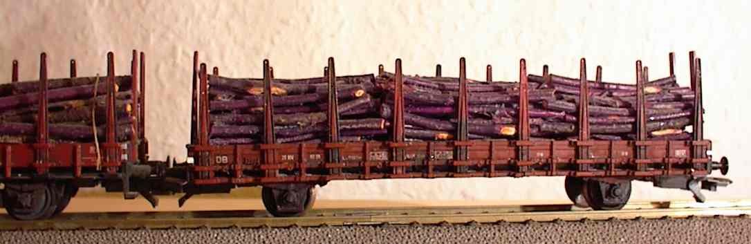 Neben der Holzladung des Musterwagens sind trotzdem viele andere Ladungen möglich, als Beispiel seien hier Heu, Rohre, Beton- oder Holzbauteile, Kisten, Torf, Maschinen oder Stahlträger genannt. Sicherlich genug Möglichkeiten, um auch den 7. R 20 noch ansehnlich beladen zu können... und im Zweifel gibt's ja immer noch das undefinierbare Teil unter der nässeschützenden Wagendecke :-) oder die Möglichkeit, ausnahmsweise mal einen Wagen leer laufen zu lassen.