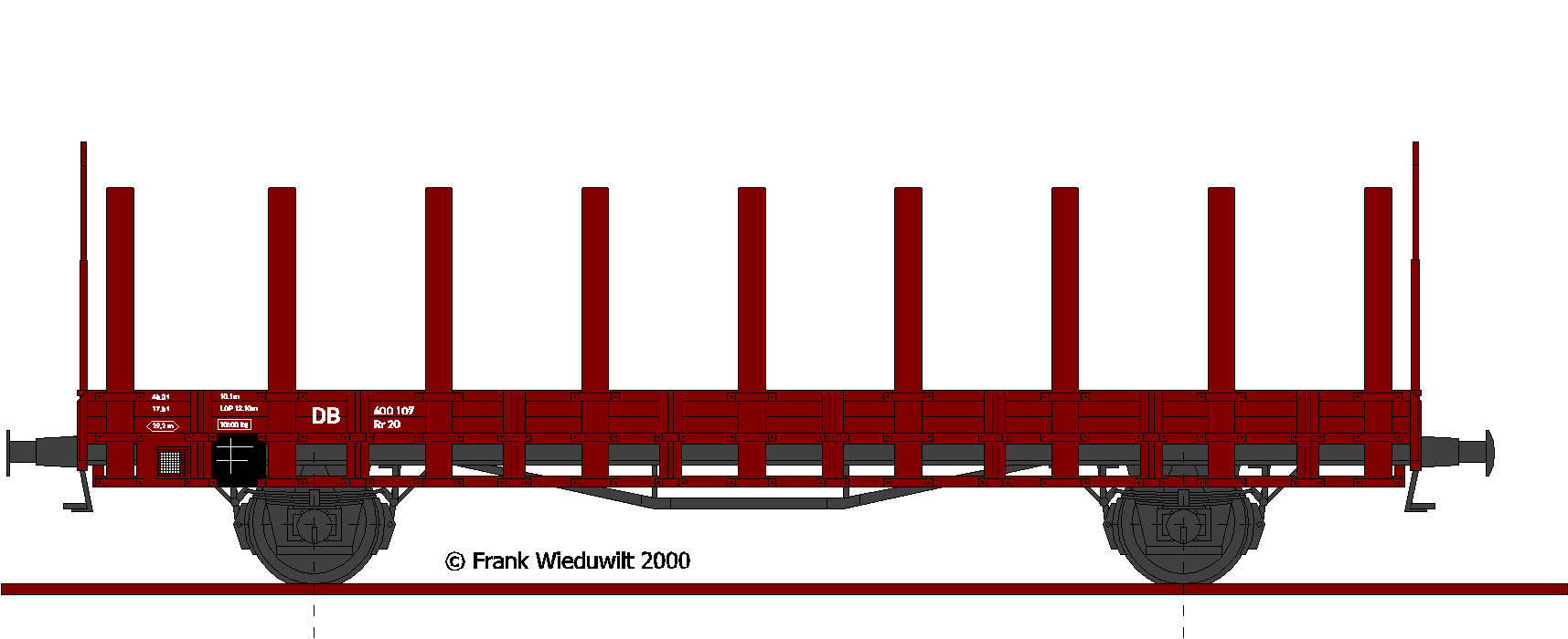 Die Stirnwände werden ab der untersten Bretterfuge abwärts schwarz lackiert; der Rungenstützrahmen (das ist das Teil, auf dem die untersten Rungenhalter sitzen) könnte m.E. ebenfalls schwarz gewesen sein (er war es z.T. beim R 10). Die Innenseite gehört wie bei allen offenen Wagen grau, der Rest des Wagenkastens rotbraun, das Fahrwerk schwarz. Ich habe auf eine Neulackierung allerdings verzichtet.