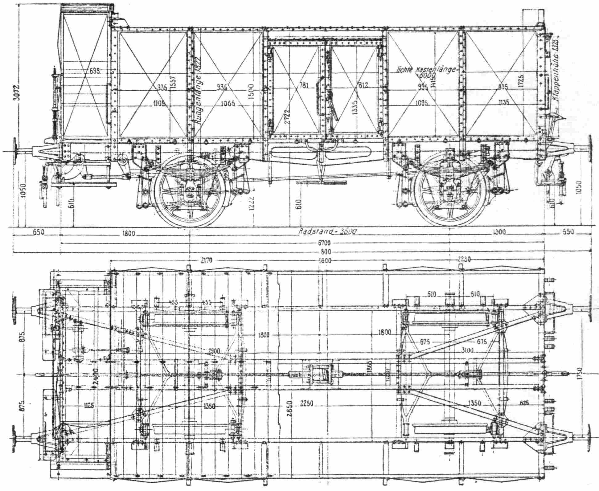 "Zweiachsiger Kohlenwagen der preuß. Staatsbahnen mit Spindelbremse. Der Wagen ist ganz aus Eisen gebaut. Langträger und Achshalter sind aus einem Preßblech hergestellt. An jeder Langseite befindet sich eine Doppelflügeltür; Die Stirnwand auf der Nichtbremsseite ist aufklappbar. Die Wände sind aus Preßblech (Buckelblech) angefertigt."
