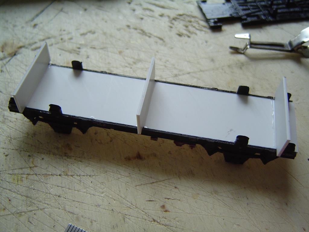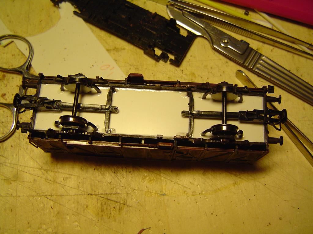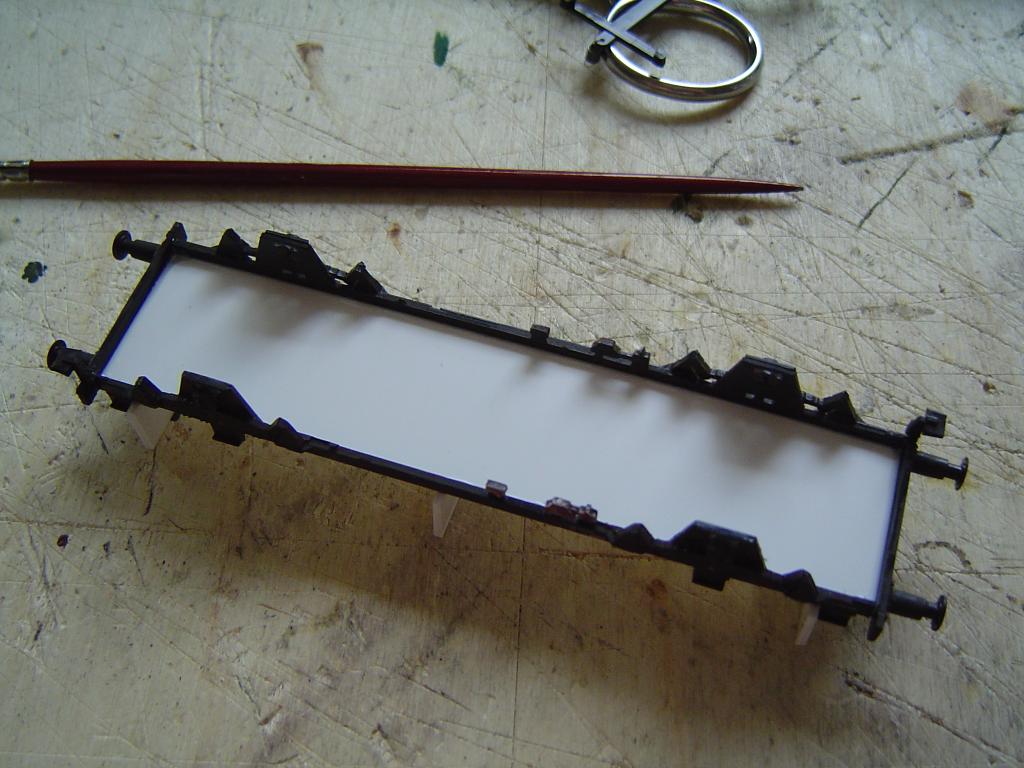 Die Nasen an den Langträgern haben keine Funktion mehr, aber Fahrwerk und Wagenkasten müssen ja trotzdem noch verbunden werden. Deshalb kommen hochkant auf die Kunststoffplatte ein paar Stücke PS, 29,3mm breit und etwa 15mm hoch. Diese können später mit dem Wagenkasten verklebt werden.