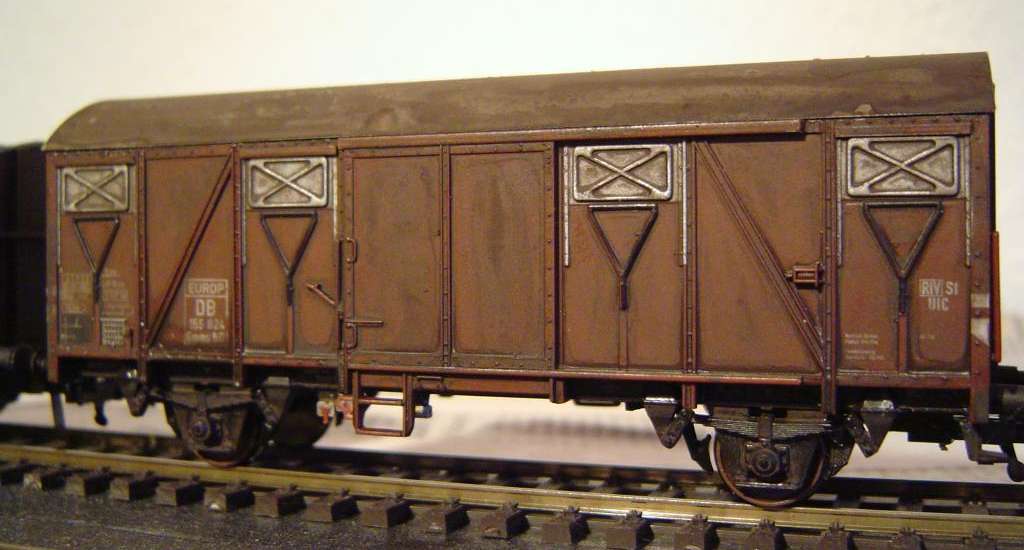 Der Umbau "gilt" natürlich auch für die anderen in gleicher Weise konstruierten ex-Röwa-Wagen aus dem Roco-Programm: zum einen für den UIC-Bretterwand-G-Wagen, der als DB-Wagen zwar kein Vorbild hat, wohl aber als Wagen der SNCF, DSB oder FS, und zum anderen für den Gms 54 und den Pwghs 54. Daß man bei der Gelegenheit auch gleich die Bremserbühne eines Gms 54 an einen aus dem gezeigten Modell gebauten Gmms 40, Gmms 44, Gmmhs 56 oder Gmms 60 frokeln und den Gms 54 als nicht-handgebremsten Wagen fertigfrokeln kann, sei nur am Rande bemerkt.