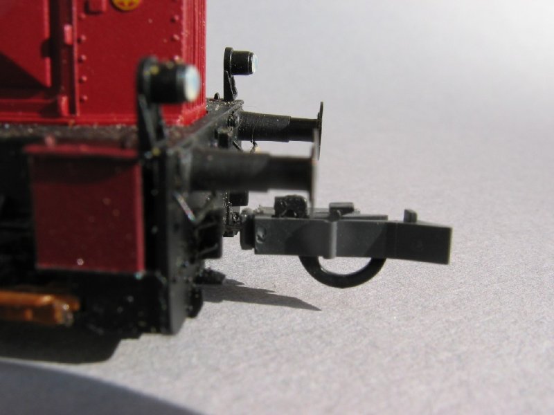 Als "Versuch" wurde ein Kurzkupplungskopf aus dem Set mit dem höhenverstellbarem NEM-Adapter mit einem 0,3mm-Federstahldraht in der Pufferbohle befestigt. In die Pufferbohle und den Kupplungkopf wurde je ein Loch 0,3mm gebohrt und der Draht mit Kleber fixiert.