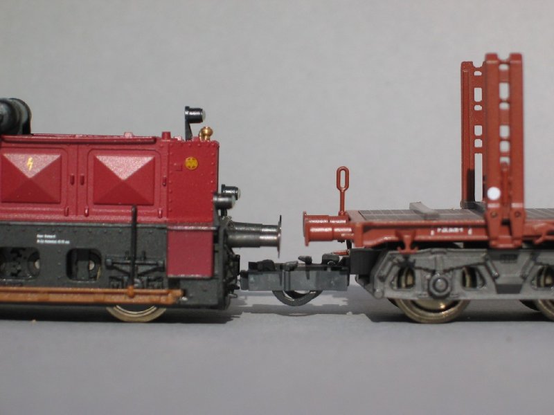 Der Kupplungsabstand wurde so gewählt, daß es bei Fahrzeugen mit und ohne Kulisse nicht zum Verhaken der Pufferteller kommt. Testfahrten auf einer Anlage bis zu Radius 452mm (Roco R4 Code 100) verliefen ohne Probleme, so dass auch die zweite Seite mit diese Kupplungsbefestigung ausgestattet wurde.